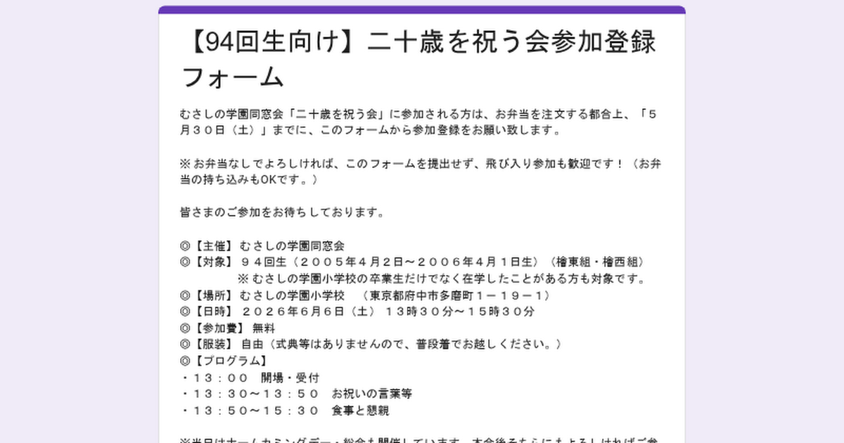 | 対象 | 94回生(2005年4月2日~2006年4月1日生) ※ むさしの学園小学校の卒業生だけでなく在学したことがある方も対象です。 |